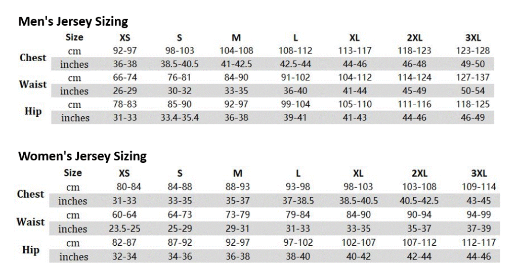 Jersey’s: Measurements for the jersey sizing is based on wearing it close to the body – like RACE FIT. This allows the jersey to perform optimally by allowing the fabrics to wick properly, improve aerodynamics by reducing drag of excess fabric in the wind, and prevents the rear pockets from sagging. If you prefer a more relaxed fit, consider sizing up.